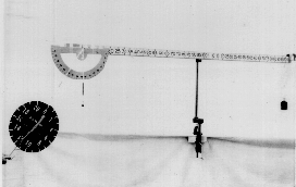 DESCRIPTION: A torque is produced on the two-meter scale by hanging a weight on the right side of the fulcrum. This torque can be balanced by pulling downward with the dynamometer with different forces at various angles on either side of the plumb line.