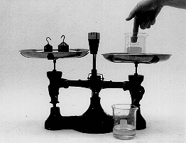 DESCRIPTION: A beaker of water is balanced by two brass weights. Q: If you stick your finger into the water about up to the first knuckle, will (a) the water beaker side go down, (b) the weight side go down, or (c) the system remain in equilibrium? A: The water side will go down. The water exerts a buoyant force on your finger, so your finger exerts a reaction to the buoyant force on the water, thereby causing the water side to go down.