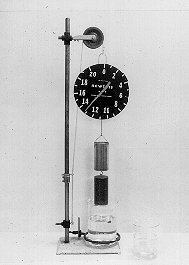 DESCRIPTION: Hanging from the balance are a hollow can and a solid cylindrical metal block of the same volume V. Lowering the metal block into a beaker of water results in a buoyant force equal to the weight of a volume V of water. Pouring the volume V of water into the can restores the original weight as read on the spring scale.
