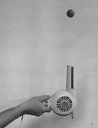 DESCRIPTION: Using the airstream from the hairdryer (with heater element disconnected), one can suspend a ping pong ball in the air. As the hairdryer is slowly moved or slightly tilted, the ball follows the airstream.
