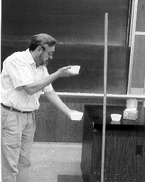 DESCRIPTION: Stacks of different numbers of coffee filters are dropped from various heights. The viscous force is proportional to the square of the velocity, so the terminal velocity is proportional to the square root of the number of filters in the stack. A stack of four filters will have a terminal velocity twice that of a single filter; the stack of four will therefore take the same time to fall two meters that a single filter takes to fall one meter. A stack of two filters will fall 1.4 meters in the time a single filter falls one meter, as is being demonstrated by the gentleman in the photograph.