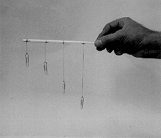 DESCRIPTION: When a group of people concentrate on one of the pendula, held as shown by the instructor, their psychoacoustic brain waves rapidly become in phase, producing enough mechanical energy to make only that pendulum oscillate. Although there may be alternative explanations of this device which make use of the concept of driven resonance, many people continue to believe that brain waves can cause this very startling effect.