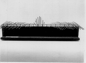 DESCRIPTION: Starting identical pulses from both ends simultaneously, either in or out of phase, they can be observed as they pass. For two identical pulses, move your hand rapidly down and up at the center of the machine. The two pulses created will reflect off the ends and interfere as they cross each other on their return. Repeat this with one end clamped to get a phase reversal of the pulse which reflects off that end.