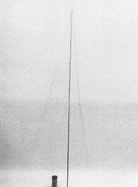 DESCRIPTION: Apply powdered violin rosin to your fingers or wear a rosined glove and stroke the aluminum rod firmly while holding it at a nodal point. Holding it in the center produces the fundamental, holding at 1/4 of the way from one end produces the second harmonic, holding at 1/6 of the way from one end produces the third harmonic, etc. The rod is about 6 ft long, and the speed of sound in aluminum is about 16,700 ft/sec, so the frequency of the fundamental is about 1400 Hz. The sound is very loud and lasts a long time; the Q for this system is around 100,000!
