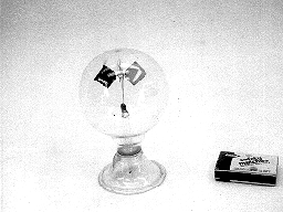 DESCRIPTION: A match or other source of light is brought near the radiometer, resulting in rotation of the vanes. Two possible explanations for this include: (1) Photons are mostly absorbed by the black side of each vane, but are mostly reflected by the white side, thus transferring more momentum to the white side, producing rotation in the direction of the black side with the white side trailing. (2) Photons are mostly absorbed by the black side, but mostly reflected by the white side, thus heating the black side more. Air molecules coming into contact with the vanes will obtain more heat energy from the black sides, colliding with greater momentum transfer from that side, thus producing rotation away from the black side. This is the correct result and explanation.