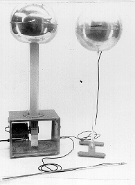 DESCRIPTION: A ground sphere is positioned adjacent to the Van de Graaff generator so that the ground sphere is charged by induction and creates large sparks. While this system is working, a grounded point is aimed at the Van de Graaff dome fro m a distance of several times the distance between the dome and the ground sphere. The grounded point discharges the dome at a much lower potential, preventing buildup of charge on the ground sphere and the concomitant spark discharge.
