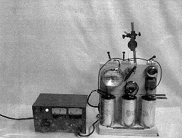 DESCRIPTION: Three capacitors totaling 205,000 microfarads are charged to 15 volts. Closing the three switches one at a time (a) turn on the light, which decays exponentially, (b) turn on the bell, or (c) activate a motor which lifts the entire system up a few inches!