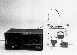 DESCRIPTION: A hot dog is mounted as shown in an overhead projection gizzit which skewers the hot dog between two nails connected to 110 VAC. The voltage applied to the hot dog and the current through the hot dog are displayed on the meters. T he total energy can be found by plotting a graph of the current as a function of time and integrating. (Actually the current is pretty much constant so you can just take an average.) The initial and final temperatures are read by the digital thermometer .
