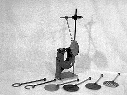 DESCRIPTION: Pendula with bobs of different materials and geometries are swung through the poles of a strong horseshoe magnet. The amount of damping is greater for those bobs in which strong eddy currents can flow. Bobs include, solid copper, copper loop, broken copper loop, laminated copper, copper with central hole, and wood.