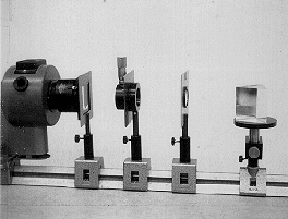 EQUIPMENT: Bright point source with condenser lens and iris, 10cm focal length cylindrical convex lens, slit, 20cm spherical convex lens, and flint glass prism.