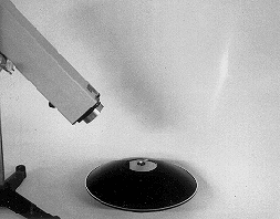 DESCRIPTION: The laser beam is directed onto the image of the penny from demonstration L3-19: PENNY AND PARABOLIC MIRRORS. It appears to be reflecting from the image.