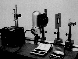 The light is defined by a slit, which is imaged on a distant screen after the light passes through the diffraction grating. Gratings of 2000 and 7500 lines per inch are furnished.