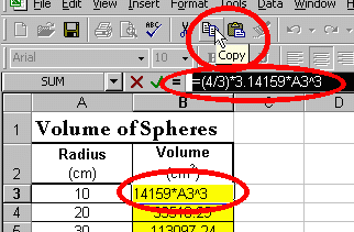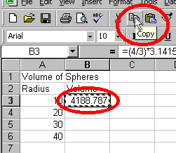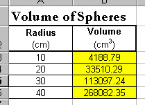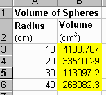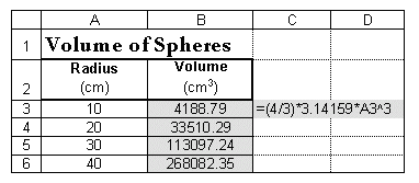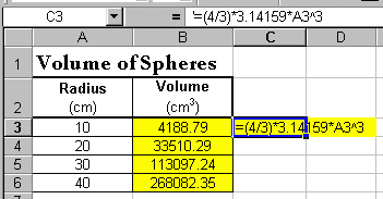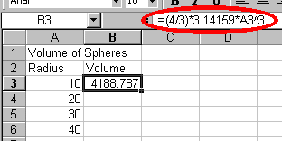 first sphere is =(4/3)*3.14159*A3^3. Enter this formula in cell B3.