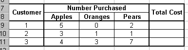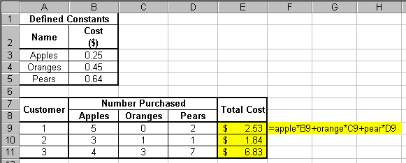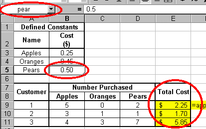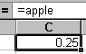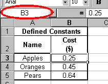 Your first step is to set up a data table like the one to the right. Notice that the words "Apples", "Oranges" and "Pears" appear next to their individual purchase cost. While this is not imperative, it is helpful to organize your table this way. Also notice the Name Box is encircled in the screen shot to the right. This indicates that cell B3 has been clicked on. You should also be aware that the formula bar indicates that the value for cell B3 is 0.25. There is nothing new here. Now we wish to define three constants that represent the cost of each produce item. Let us define our first constant as "apple" to represent the cost of an apple. To do this, follow the steps below: