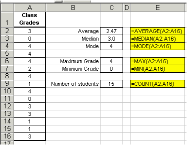 Excel has a wide variety of built-in statistics functions that give, for instance, the slope and y-intercept of a line, the standard deviation of a data sample, and the mean, median and mode of a set of values. In this tutorial we will cover a few of the more useful and popular statistics functions, but there are many more built-in statistics functions that you can learn about via Excel's help files. Basic built-in functions. (AVERAGE, MEAN, MODE, COUNT, MAX, MIN) We will use the familiar example of a class's grades to illustrate the use of some of the more basic Excel functions, like AVERAGE( ), MODE( ) AND MAX( ). Assume a class's grade distribution is as follows: 3, 0, 4, 4, 4, 2, 4, 1, 4, 0, 3, 3, 1, 1, 3. These grades are based on a 4-point scale with 4=A and 0=F and are entered into an Excel worksheet shown below. Using the AVERAGE( ) function, we find the class's average (or arithmetic mean) grade is a disappointing 2.47, or a mid-C. The syntax for this common function is =AVERAGE(number1, number2, ...) and is displayed in the screen shot below. For more information using the AVERAGE function, see the arithmetic section in this tutorial. However we don't get a clear picture of the class's performance by simply looking at its average. We can further analyze the data using the MEDIAN( ) function. The median gives the middle number in a set of numbers and its syntax is =MEDIAN(number1, number2,...). We see from the screen shot below that the median grade is 3.0, meaning that half of the grades are higher than 3.0, and half are lower. Therefore, despite the low class average, more students scored 3's and 4's than 2's, 1's and 0's. Additionally, we can also analyze the grade distribution by using the MODE( ) function. The mode gives the most frequently occurring value of a set of numbers and its syntax is =MODE(number1, number2,...). From the screen shot, we see that the mode grade is 4, meaning that a score of 4 was the most common grade. Again, the instructor of the class can take heart that, despite the low class average, more students made A's than any other grade. Without going into too much detail, we can also use some of Excel's built-in functions to determine the number of grades entered, and the maximum and minimum grades of the distribution. The syntax for these functions are shown below in the bulletted list and also in the screen shot.